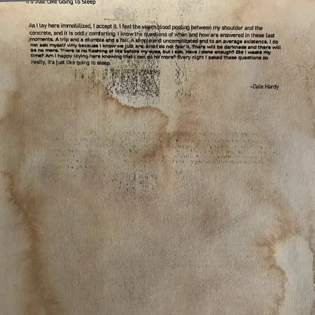 There is no flashing of life before my eyes, but I ask. Have I done enough? Did I waste my time? Am I happy laying here knowing that I can do no more? Every night I asked these questions so really, it’s just like going to sleep.