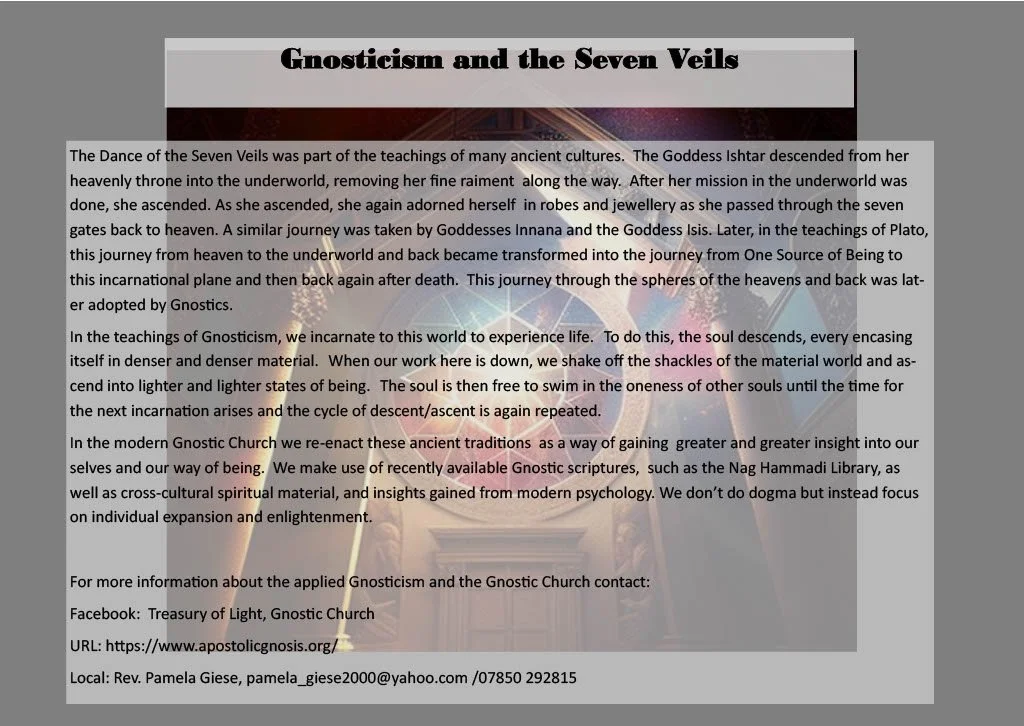 Pamela writes: “In the ancient wisdom traditions, the Dance of the Seven Veils was the reenactment of the descent of the soul into incarnation on this plane, followed by the liberation or ascent of the soul out of this incarnation and into the afterlife. This dance is an initiation in the way that all initiations involve a death to the old self and a rebirth to the new.